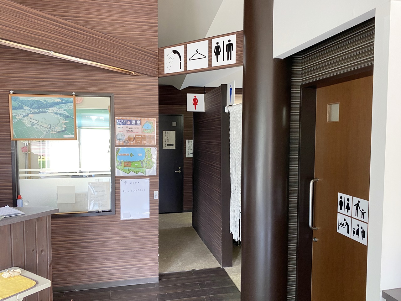 管理棟の建物の中には、トイレ(男性・女性・多目的)とコインシャワー(10分200円)、Wi-Fi、薪の販売などがあります。
