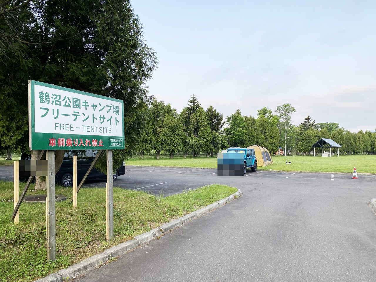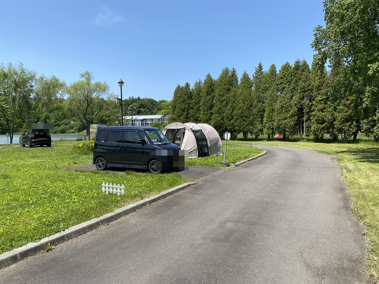 フリーサイトと駐車場が空いている時には、車のすぐ近くにテントを設営すると、セミオートサイトのように設営ができます。