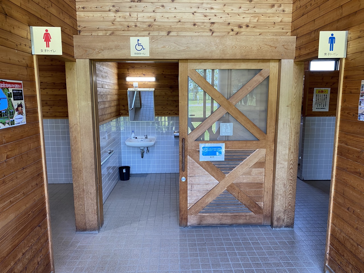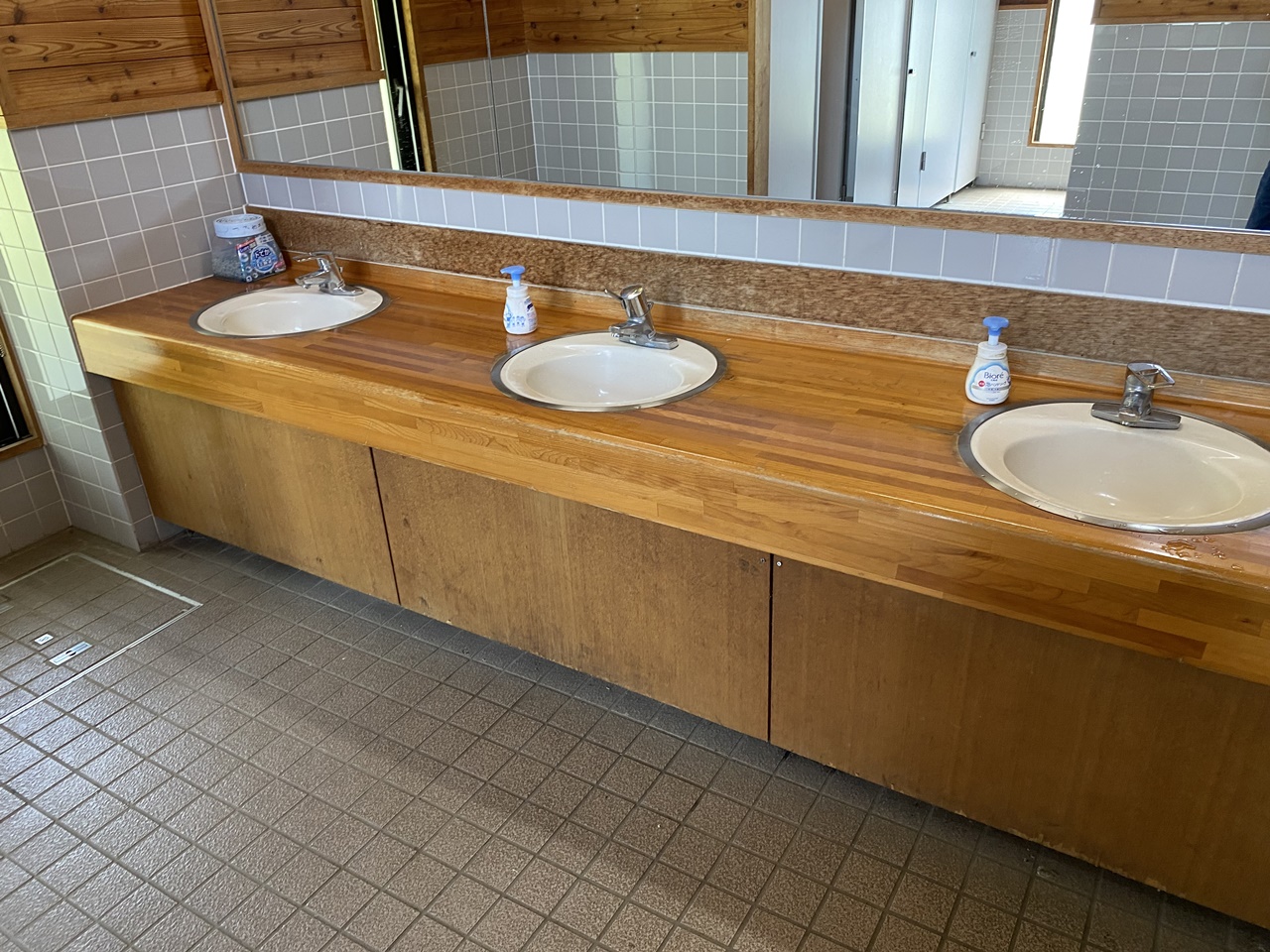 管理棟の他にキャンプ場内には、トイレはサニタリーハウスだけですが、広くて便器や洗面台の数が多いので、繁忙期もあまり混み合うことはなさそうです。