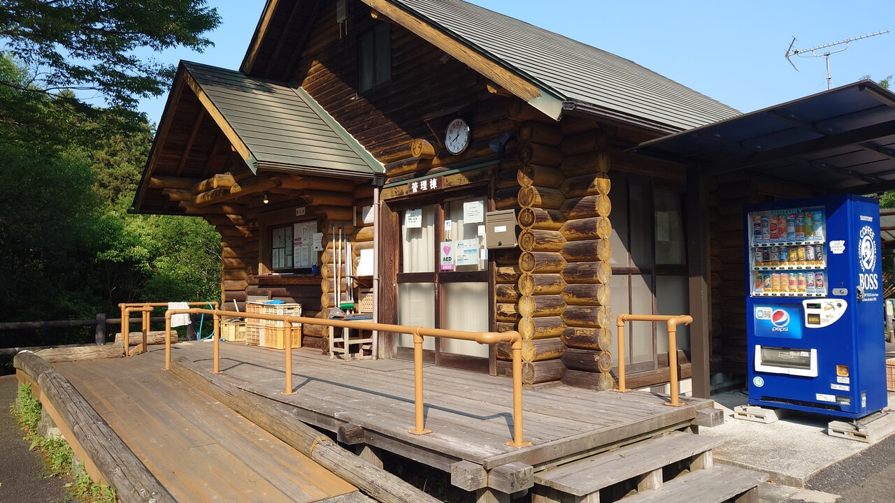 雰囲気のあるログハウスが管理棟です。こちらには自動販売機やゴミ捨て場があります。売店はありませんが、飲料用の水(2Lで150円)や薪(400円)は販売しています。薪に関してはコンテナ一杯で400円なのでかなり安いです。
