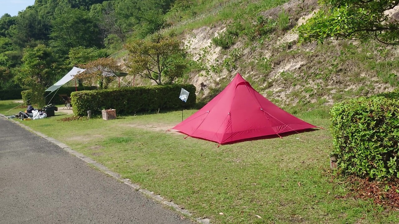 真道山森林公園キャンプ場は全て区画サイトであまり広くはありません。元々の1区画はかなり狭いので現在は2区画を1区画として予約を取られています。それでもタープを張ったりファミリー用の大型テントや2ルームテントの場合は1区画に設営するのは難しいので、複数区画を予約するか予約時にご相談することをおすすめします。(場所によっては3区画を1区画としているサイトも有ります)